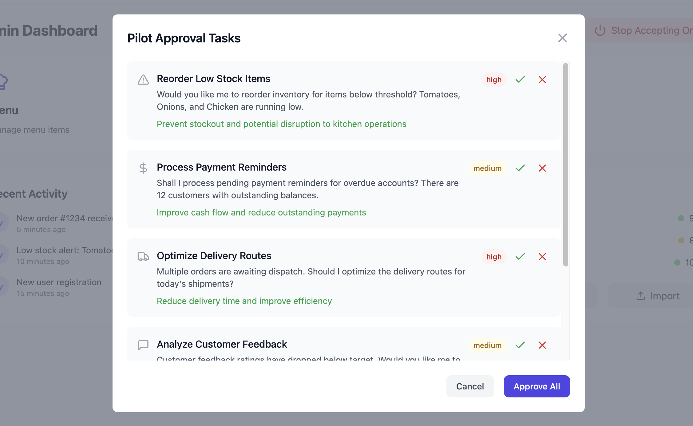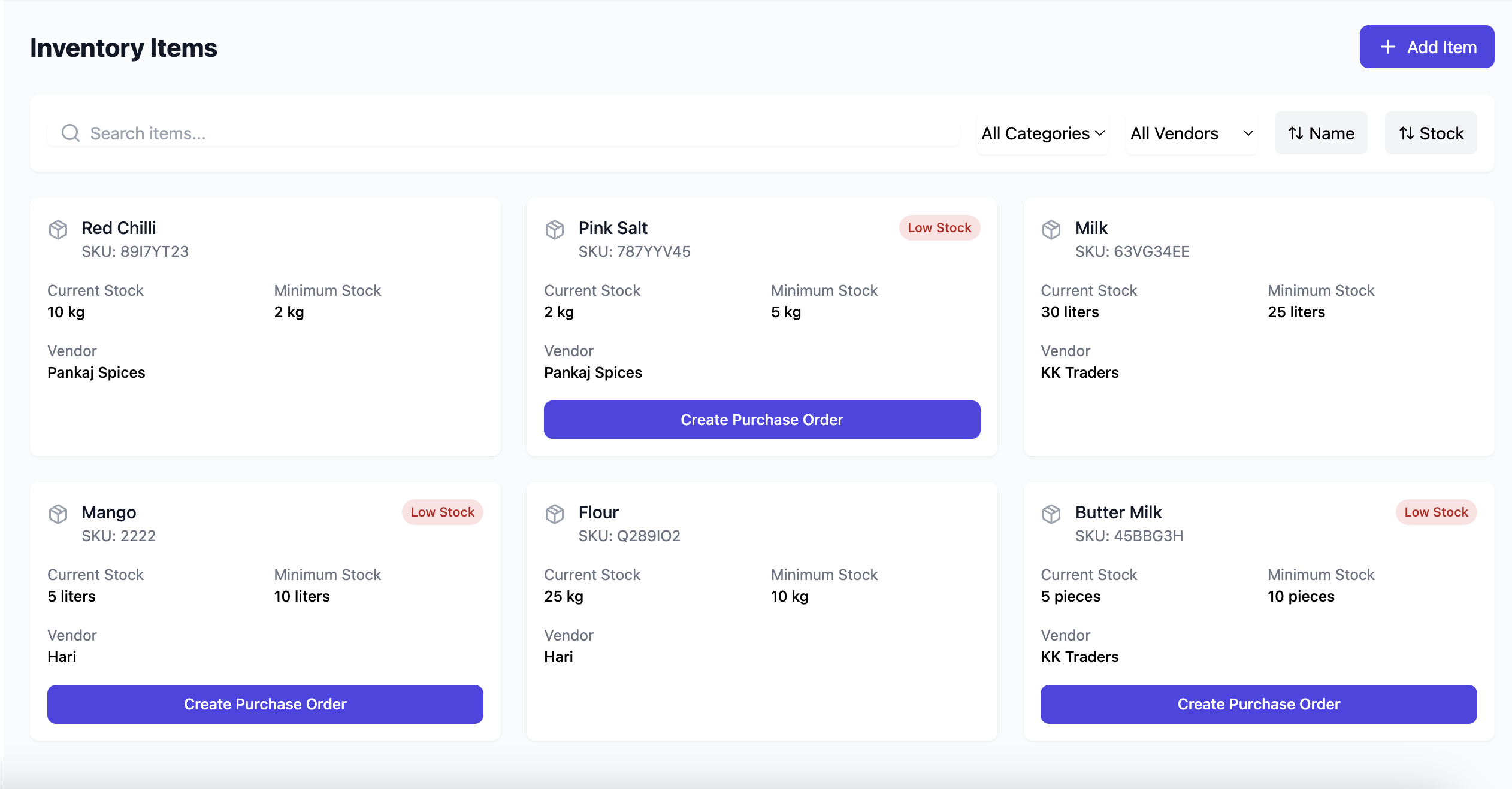 Rasoi Pilot tracks stock levels, predicts shortages, and places purchase orders automatically—so you never run out of what you need.